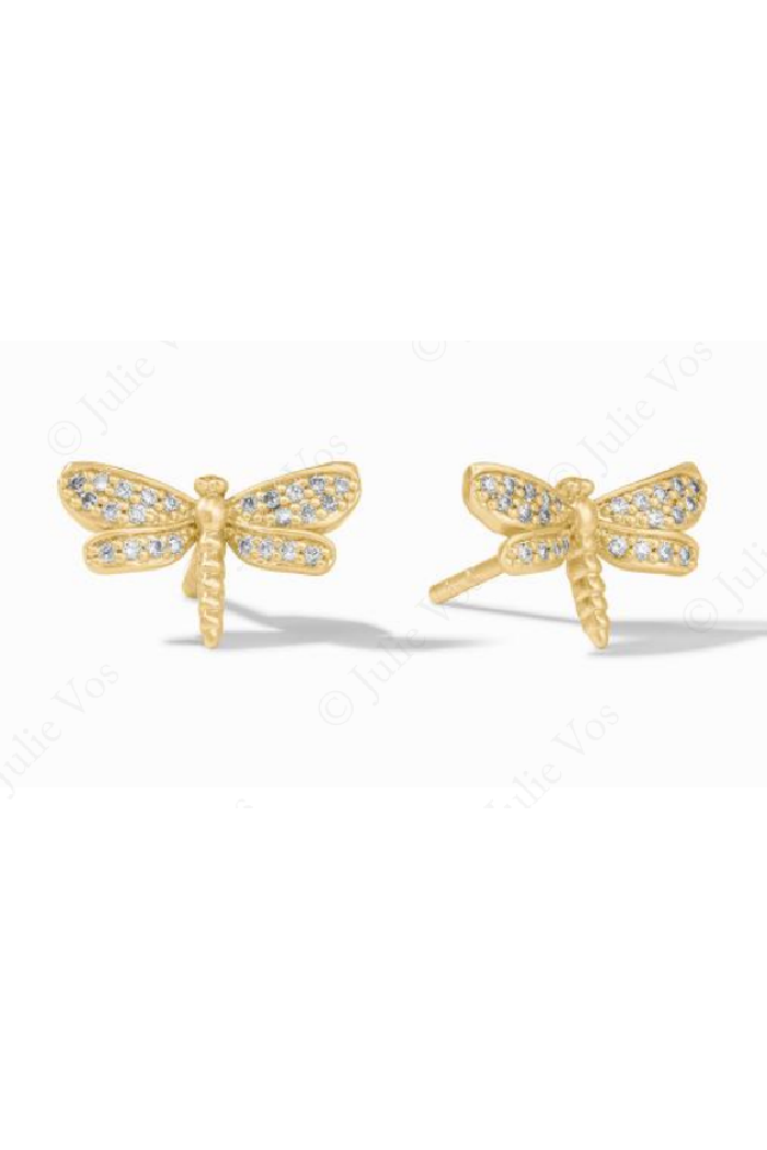 Delicate dragonfly-shaped pavé stud earrings with a warm gold finish and sparkling crystal accents add a subtle, whimsical touch to everyday looks. The Dragonfly Pavé Stud is petite and polished for versatile wear from morning coffee to evening plans. These earrings are crafted by Julie Vos, whose designs blend playful motifs with refined detailing for an elevated, feminine aesthetic.