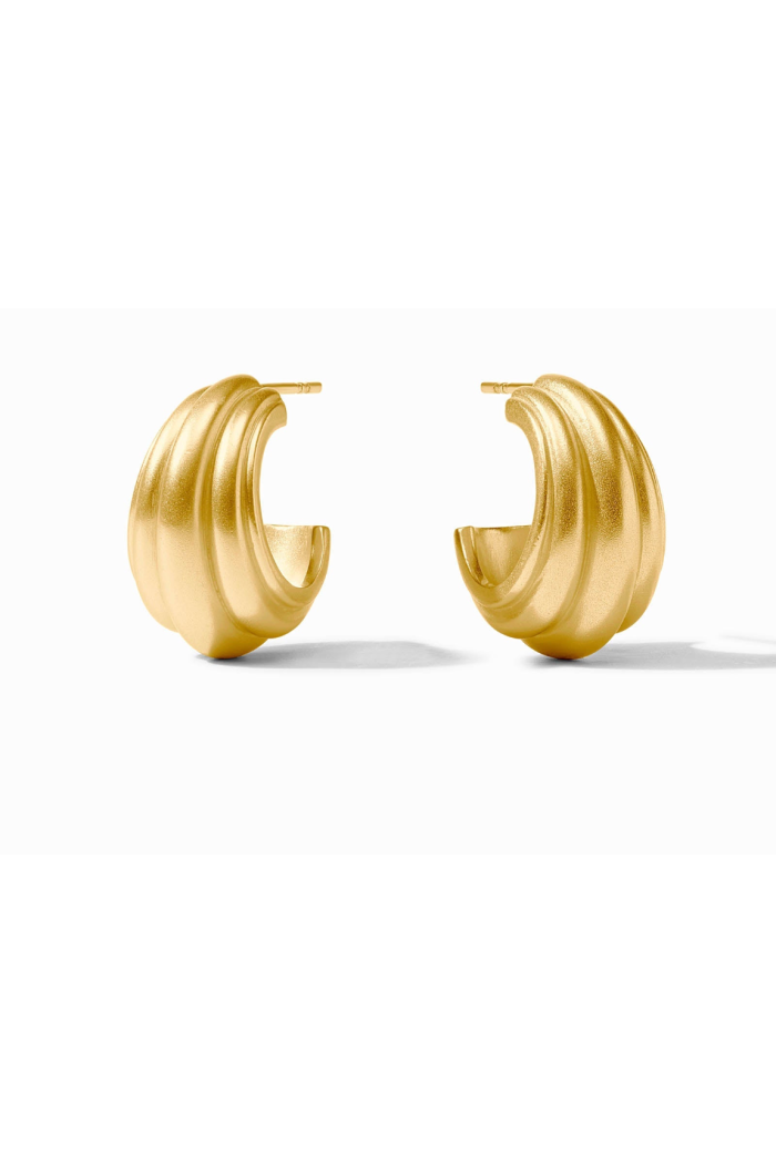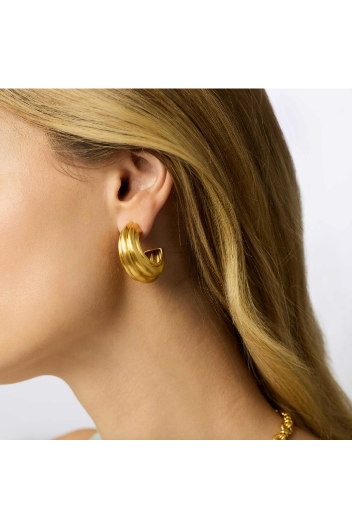 A sculpted small hoop with bold, ridged contours that read as a modern statement. The Portofino Statement Hoop - Small is finished in a warm gold tone and designed to sit close to the earlobe for a polished silhouette. This piece is crafted by Julie Vos and bridges everyday wearability with a refined, jewelry-forward look.
