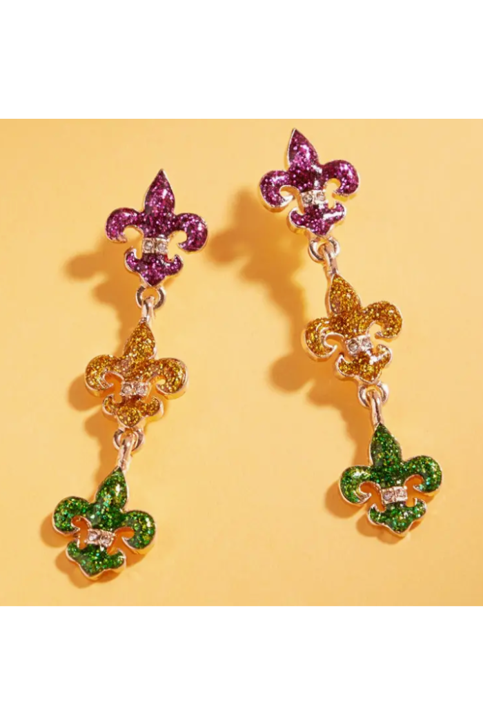 Shimmery multicolor fleur-de-lis motifs cascade in a bold, dangling silhouette for a playful statement. The Three Fleur Dangle Earring features gold‑tone links and glittered enamel accents for eye-catching sparkle. These long drop earrings bring a festive, modern twist to classic fleur styling. they’re perfect for dressing up evening looks or adding color to casual outfits.