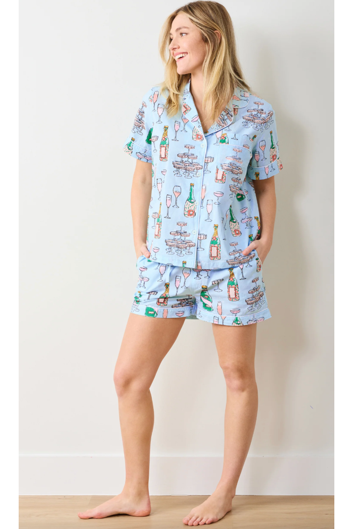 Fit: Button-down top with relaxed fit and comfortable silhouette. Mid-rise shorts featuring elastic waistband, adjustable drawstring, and 2 ¼" inseam.