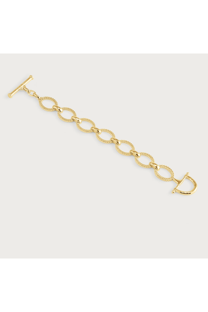 A gold chain-link bracelet featuring braided oval links and a toggle clasp for easy wear. The Cheval Chain Bracelet Gold has a polished finish with subtle texture on each link for added dimension. Designed by Anabel Aram, it layers effortlessly with other wrist jewelry or stands alone as a sculptural accent.