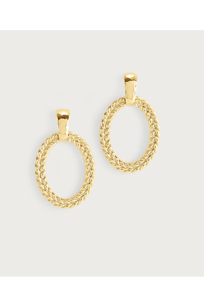 A pair of oval, rope-textured hoop earrings in a warm gold finish. The Cheval Ring Earrings are lightweight drops with a polished bail and braided detailing that catch the light. Beautiful for everyday wear or dressed-up occasions, they offer a classic silhouette with subtle texture. Designed by ANABEL ARAM, these hoops bring refined shine to any jewelry stack.