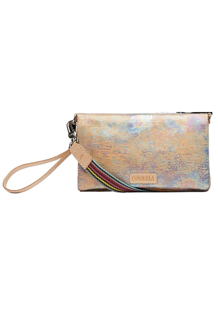 Included detachable wristlet strap and adjustable woven crossbody strap