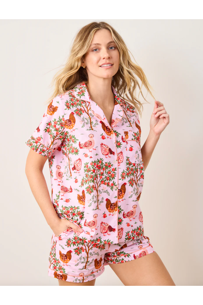 Fit: Button-down top with relaxed fit and comfortable silhouette. Mid-rise shorts featuring elastic waistband, adjustable drawstring, and 2 ¼" inseam.