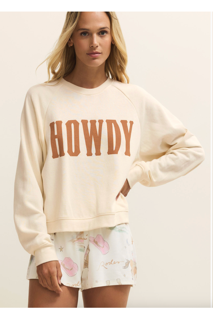 The HOWDY SWEATSHIRT is a relaxed pullover with a crew neckline and a bold printed “HOWDY” graphic across the chest. It’s made from a soft sweatshirt knit with raglan sleeves and ribbed cuffs for a cozy, lived-in feel. This casual piece comes from Z Supply and is perfect for lounging at home or running weekend errands.