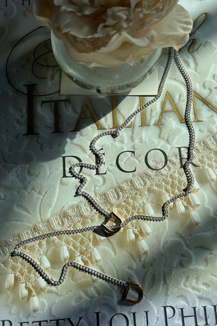 A refined lariat necklace with two-tone stirrup accents that layers effortlessly over both casual and dressy looks. The Lariat Two-Tone Stirrup Necklace features a polished chain and D-shaped stirrup details in mixed metals for subtle contrast.A modern equestrian-inspired silhouette that reads luxe yet wearable. Wear it solo or looped for added visual interest.