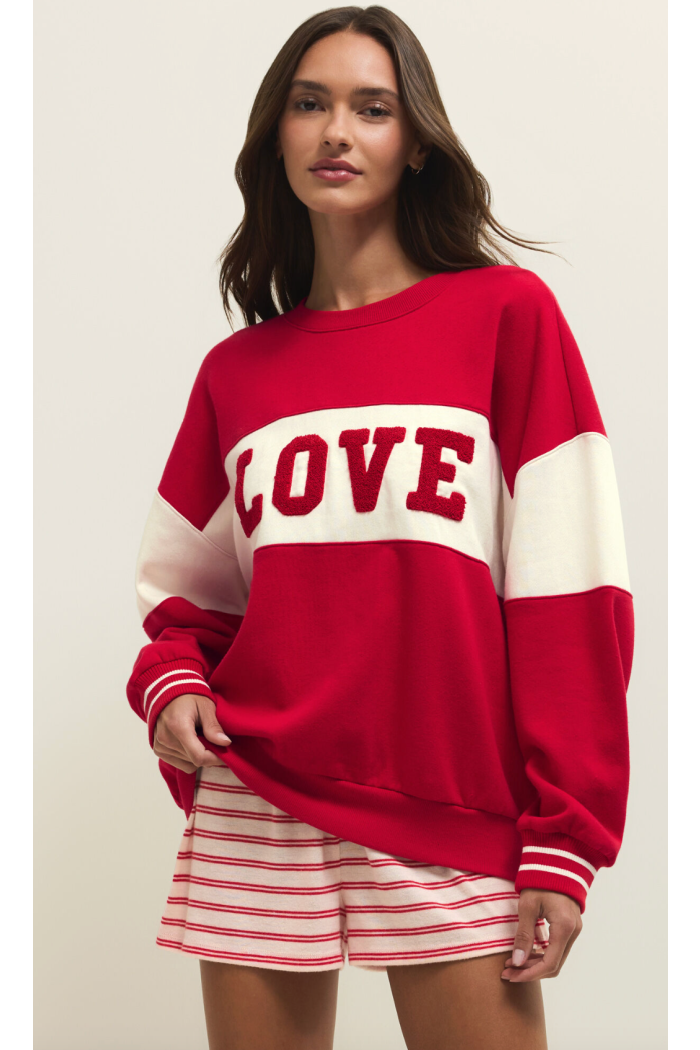 A slouchy, oversized sweatshirt with a bold varsity-style "LOVE" across the chest. The Oversized Love Sweatshirt from Z Supply is made from a cozy knit that drapes into a relaxed silhouette and features ribbed cuffs and hem. Its crew neckline and long sleeves make it perfect for casual layering or lounging at home. Pair it with denim or sleep shorts for an easy, lived-in look.