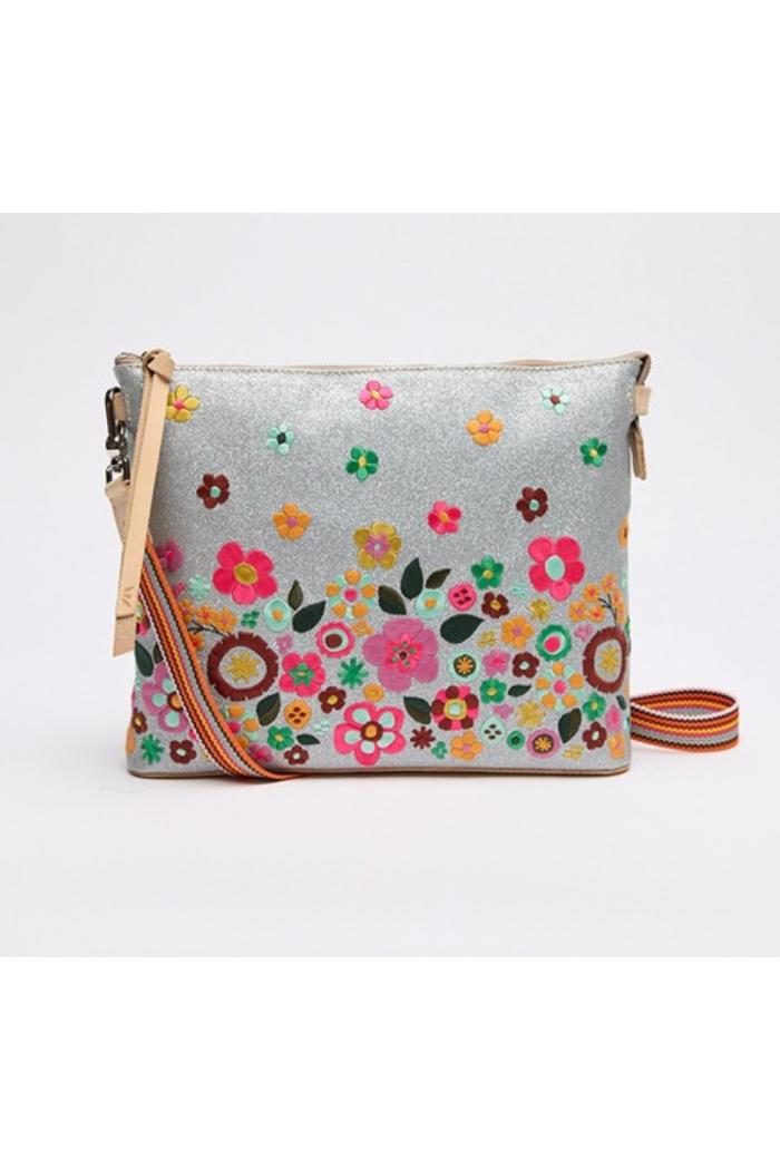 A compact crossbody patterned with bright floral appliqués and a glitter-finish body for easy daytime style. The TINK DOWNTOWN CROSSBODY features a detachable striped strap and leather trim for a playful yet polished look. This piece is made by Consuela and is ideal for on-the-town outings or relaxed, off-duty days when you want hands-free convenience.
