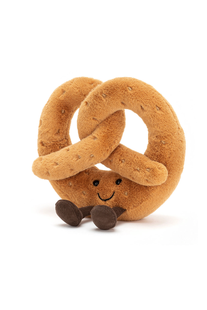 A whimsical plush pretzel with a friendly embroidered face and corduroy feet, perfect for imaginative play. The AMUSEABLES PRETZEL is soft and squeezable with stitched ‘salt’ details and a warm brown pile. This cuddly character is crafted by Jellycat and designed as a lovable plush toy for young children and collectors alike.