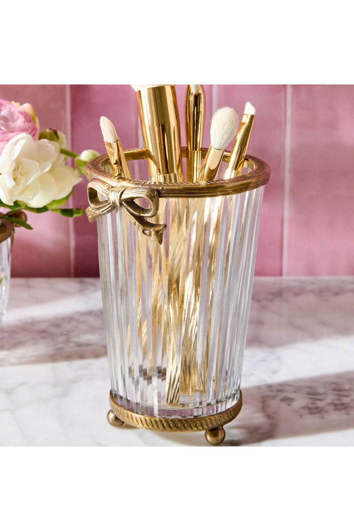 Exquisite hand-cut glass designLuxurious antique gold finishDelicate brass bow accent adds a touch of charmFunctional vase for holding flowers, makeup brushes, cotton swabs, pencils and moreVersatile piece that complements various design styles