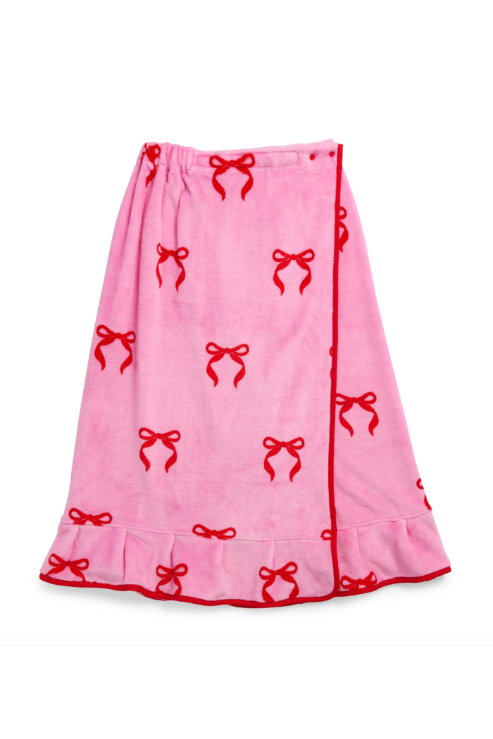 Wrap yourself in sweetness with our Bow Bath Wrap. Made from plush, cozy fabric, this pink wrap features an all-over red bow print and a playful ruffled hem. It secures easily with an elastic top and adjustable velcro closure, making it perfect for post-shower lounging or getting ready in style. With its flirty, feminine flair, this wrap is just as cute as it is comfy.