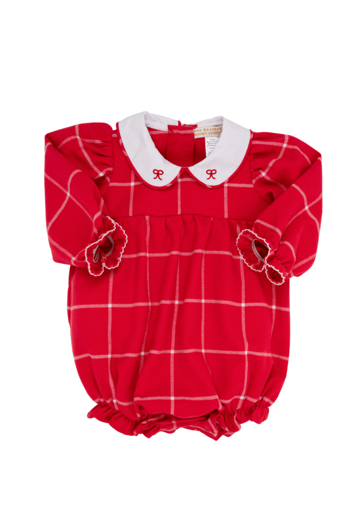 The sweetest Long Sleeve Britt Bubble has arrived! Featuring Woodland Avenue Windowpane and bow embroidery on the collar, you'll swoon over all the sweet details on this bubble.