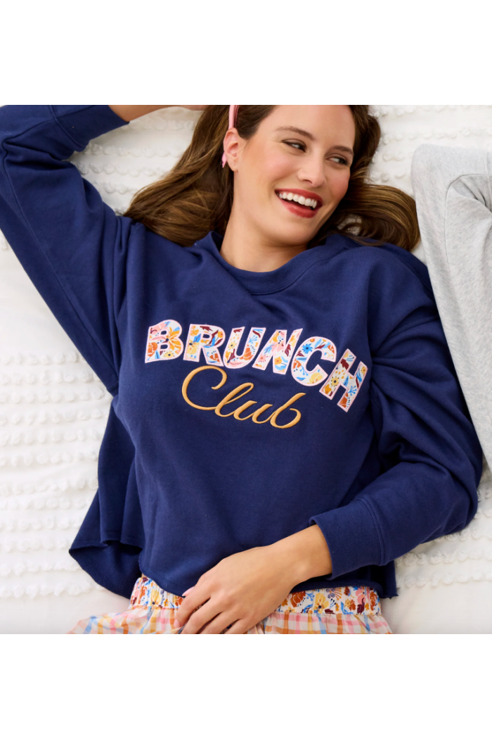 Join the comfiest club around with the "Brunch Club" Lounge Sweatshirt. Made from ultra-soft navy fabric, this relaxed-fit pullover features playful floral appliqué lettering and chic embroidered script. The slightly cropped hem adds a flattering touch, perfect for lounging or lazy brunch meetups. Style it with the matching Gingham Boxer Short for a full set or mix and match with other cozy separates for your ultimate off-duty look.