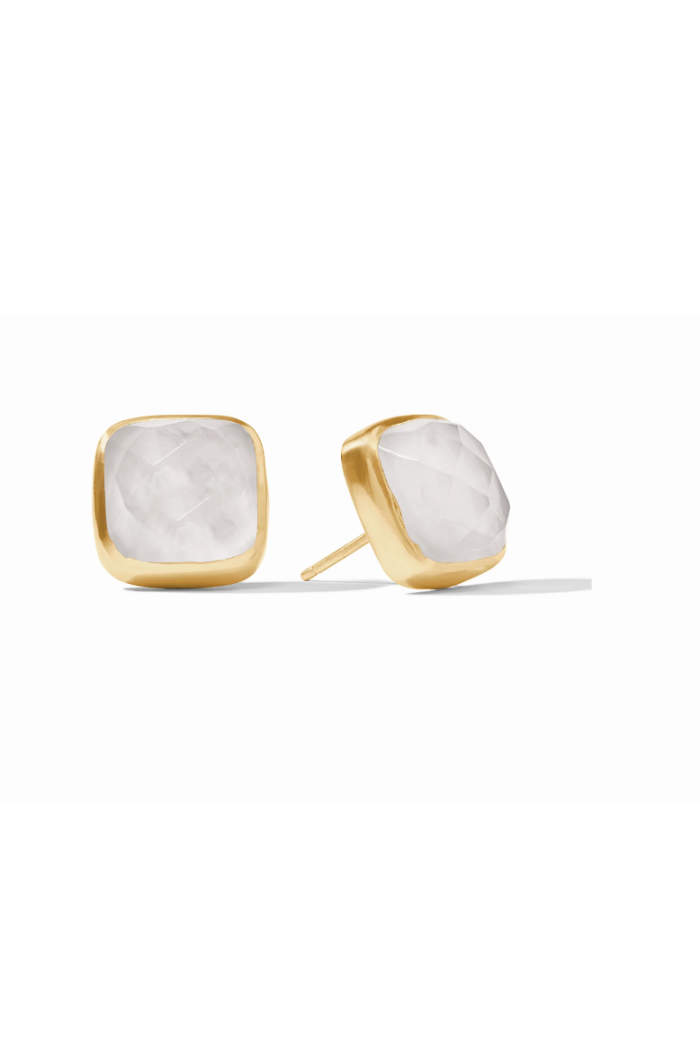An eye-catching faceted soft square gemstone in a burnished golden setting.