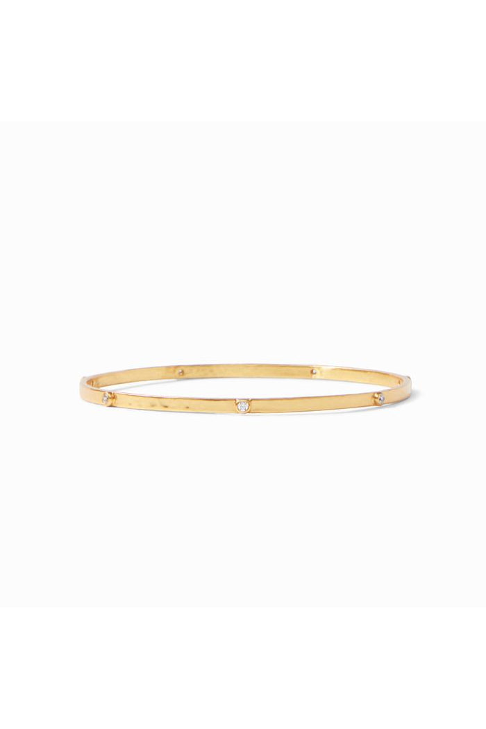 Lightly hammered bangle with gemstone stations. 24K gold plate.