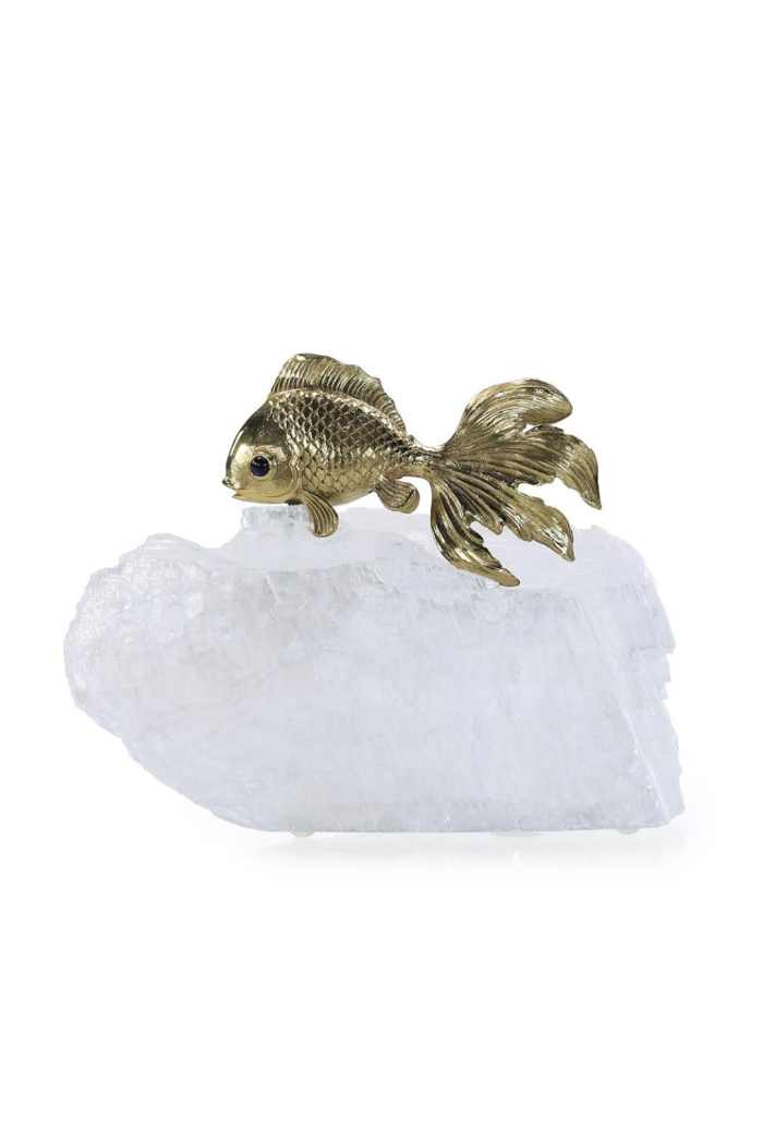 This naturally inspired sculpture is a stunning decorative accent that faithfully recreates the look of a fantail goldfish. Crafted from brass, the fish showcases intricate detailing in its scales and flowing fins. The fish gently rests atop an organically shaped selenite slab.