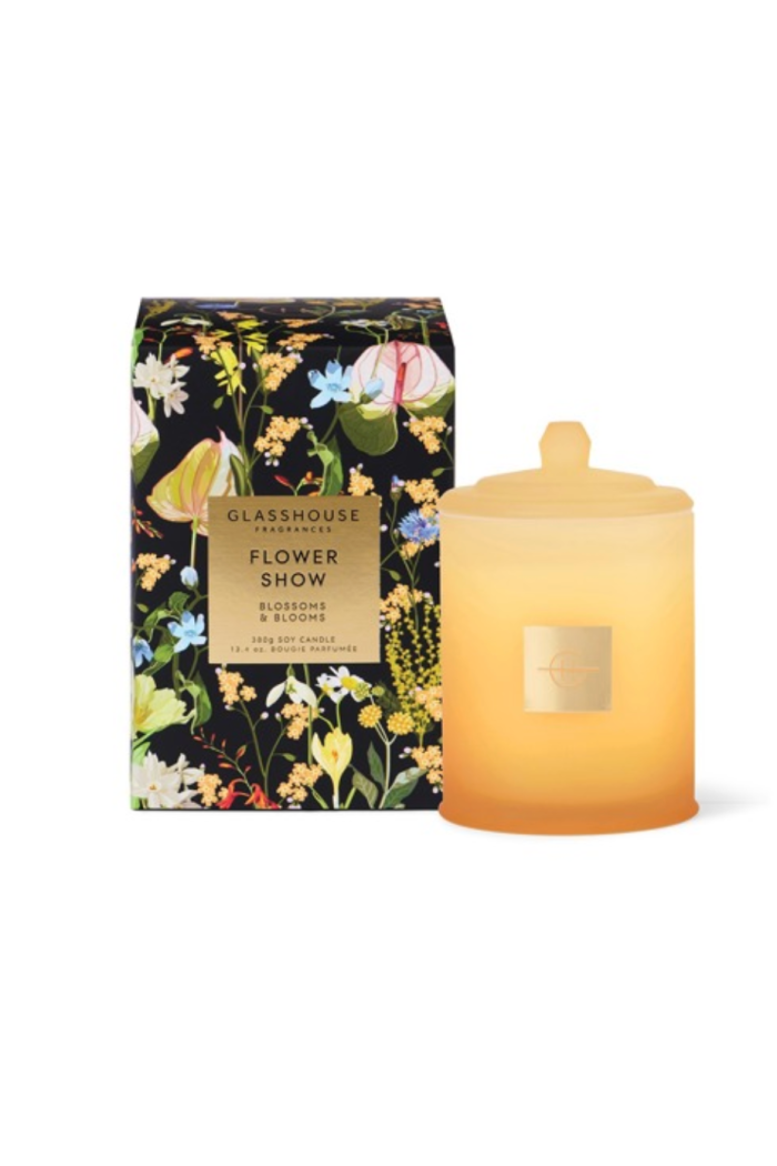 A scented soy candle presented in a frosted glass jar with a matching lid and decorative gift box. The Flower Show 13.4 oz Candle offers a bloom-forward fragrance profile ideal for living rooms or bedside tables. Glasshouse Fragrances crafted this candle to deliver long-lasting scent and an elegant tabletop presence. It makes a polished gift or a fragrant finishing touch for your home decor.