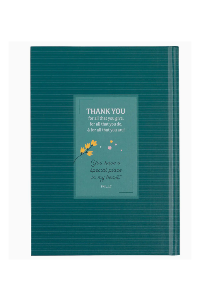 Show your child's teacher just how much you value her dedication and hard work with the Blessings for a Great Teacher Hardcover Gift Book as part of a teacher appreciation gift. This charming book serves as a heartwarming token of appreciation for the educators who invest their time and energy in nurturing young minds. With a colorful collection of inspirational quotes and Scripture, it's an ideal way to express gratitude and encouragement. An open book growing bright flowers decorate the light teal front cover of the gift book and ground the title that is presented in multi-colored fonts. Blessings for a Great Teacher A dark teal band runs along the spine and spills over to the back cover, where a special message that underscores the profound impact teachers make on their students' live is framed in a light teal box. Thank you <