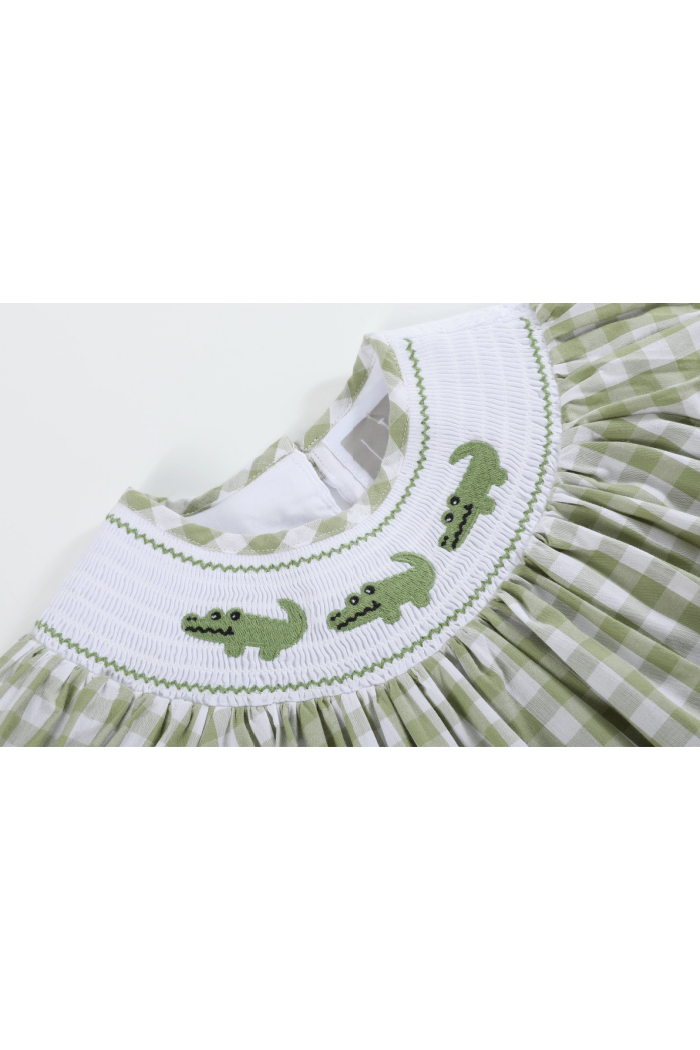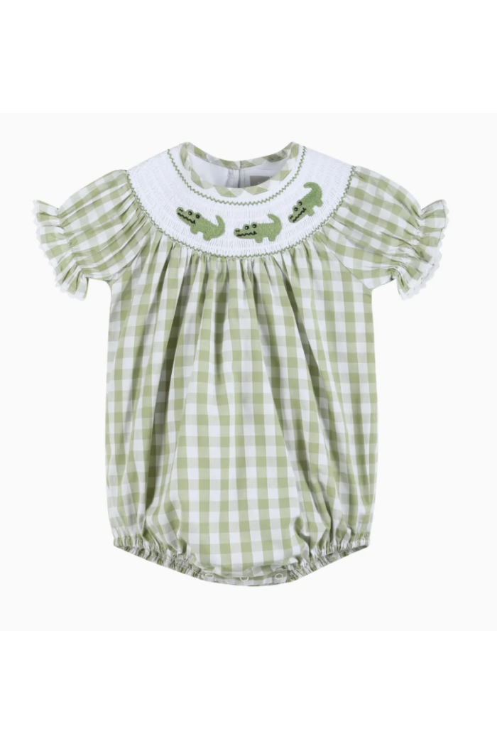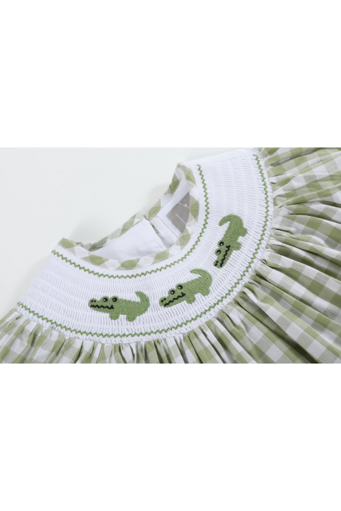 This Light Green Alligator Smocked Romper is perfect for your sweet girl’s adventurous spirit! Featuring delicate smocking along the neckline and charming embroidered alligators, it adds a playful touch of whimsy. Made from soft, breathable cotton, this romper ensures all-day comfort. The convenient snap closures make diaper changes quick and easy. Ideal for fall outings, family gatherings, and outdoor play, it’s a stylish and practical addition to your little girl’s wardrobe.