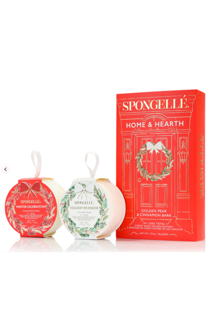 Wreath gift set, a luxurious blend of festive charm and high-quality skincare. This set includes two Holiday Wreath body buffers in Golden Pear and Cinnamon Bark. These beautifully crafted, wreath-inspired Body Wash Infused Buffers® make perfect ornaments or stocking stuffers, adding elegance to any holiday décor. Each buffer is infused with a rich, long-lasting fragrance and a nourishing formula that not only cleanses and exfoliates but also massages and nourishes the skin, ensuring a pampering experience. Each body buffer is good for 7+ uses.