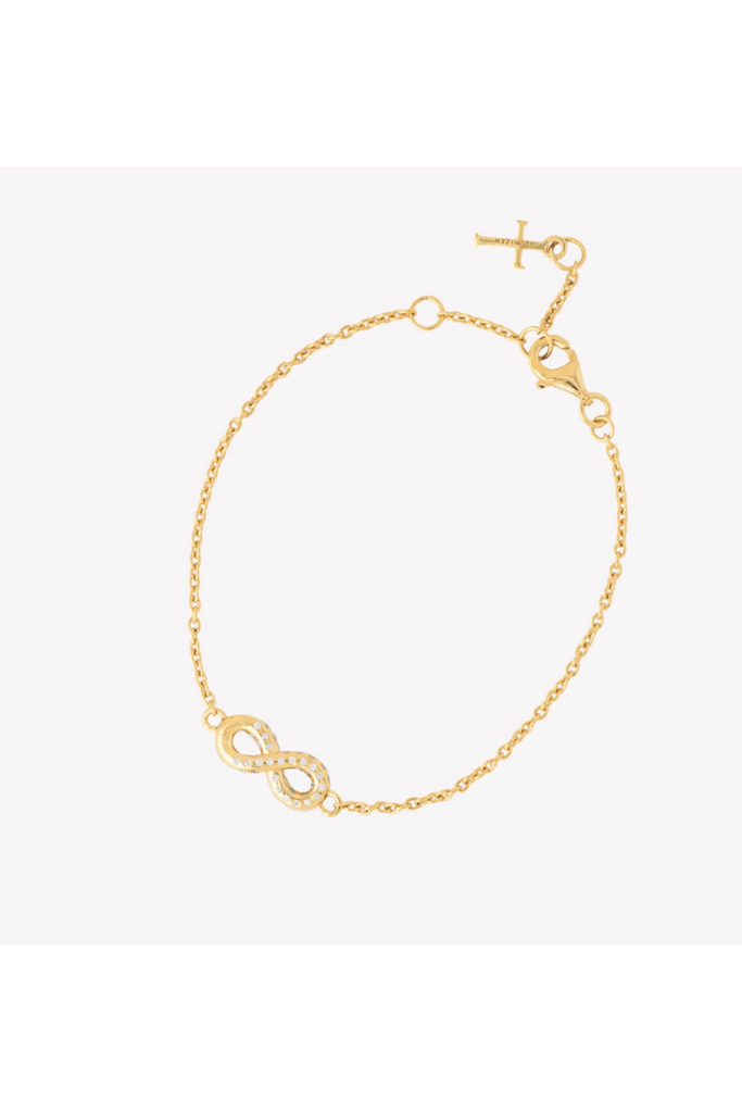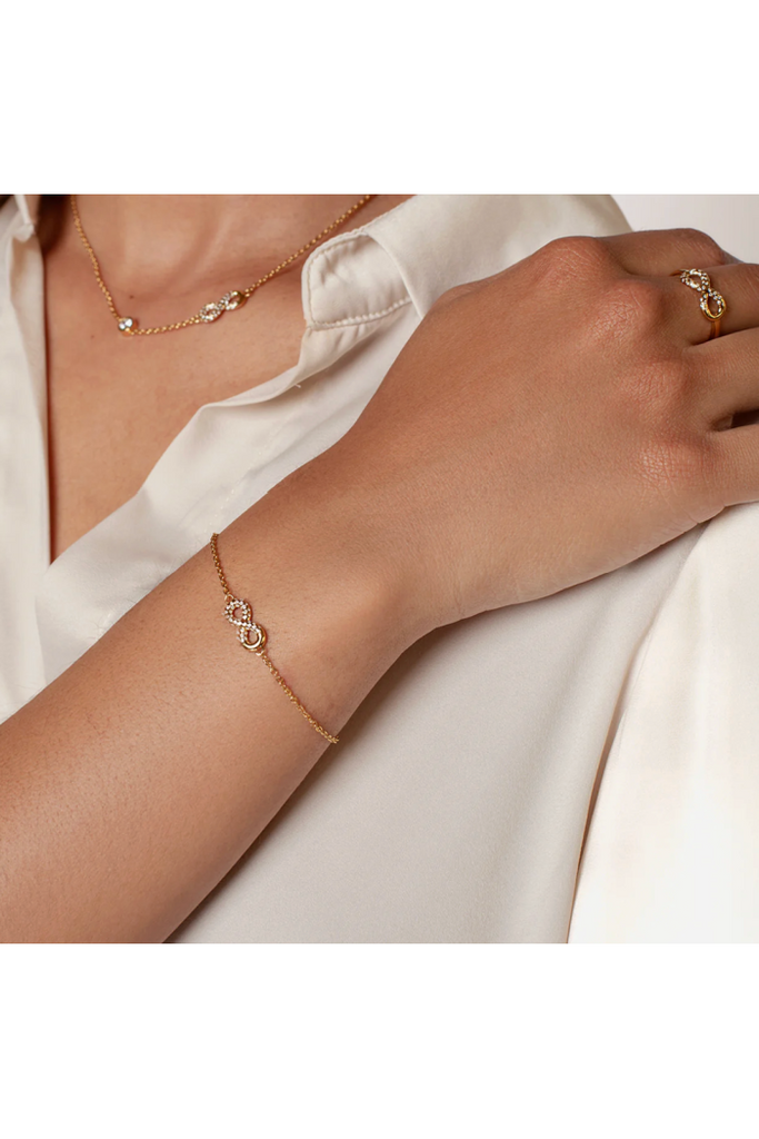 Hand-finished in 18K gold vermeil, the bracelet features an infinity symbol pendant adorned with pavé stones forming an ichthys fish in sparkling zirconia, adding both meaning and texture to the front of the piece. The reverse side is smoothly polished, lending the design the classic, understated elegance of fine jewelry.