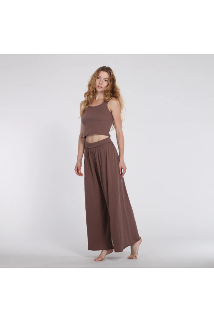 Pictured with top (sold separately) 100% Supima Jersey Cotton body. 90% Cotton and 10% Spandex waistband. Relaxed through the leg with a subtle flair. 29.5" Inseam with raw-edge hem