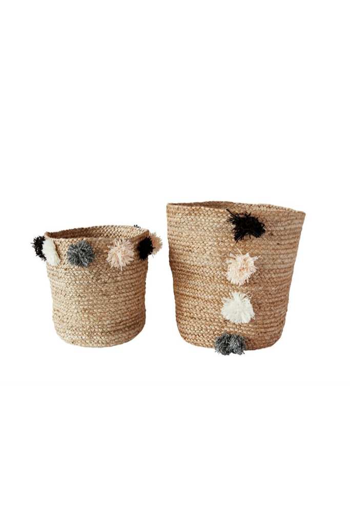 JUTE BRAIDED BASKET W/ POM POMS LARGE