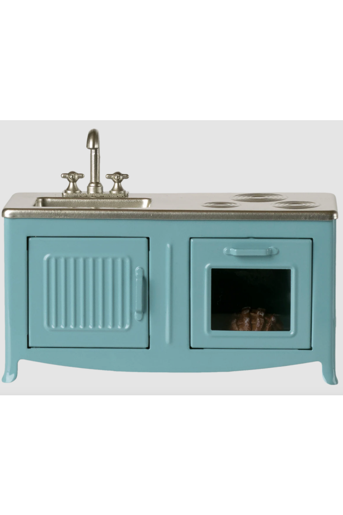 The heart of every home is the kitchen. This metal kitchen has a beautiful color tone and has many playful details such as a cabinet door, sink and an oven with a freshly baked pie. It is a perfect size for the mouse family.