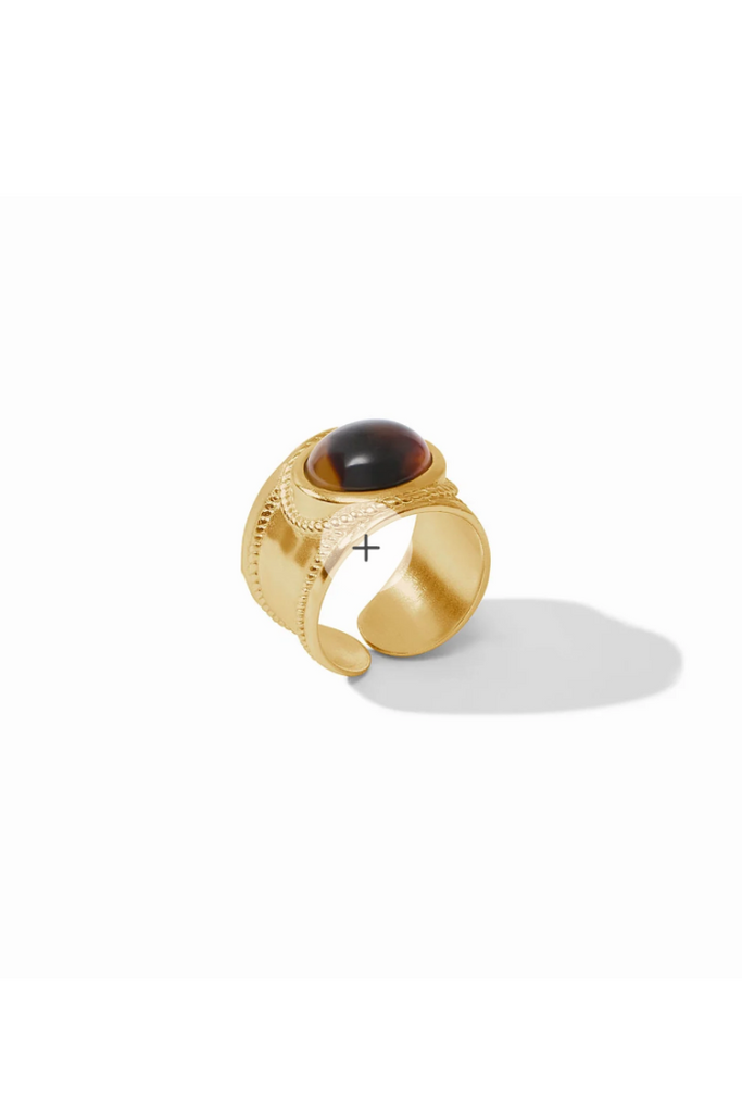 An elegantly domed oval of polished translucent tortoiseshell set in twisted golden wire, with a lightly hammered wide gold shank with matching wire accents.
