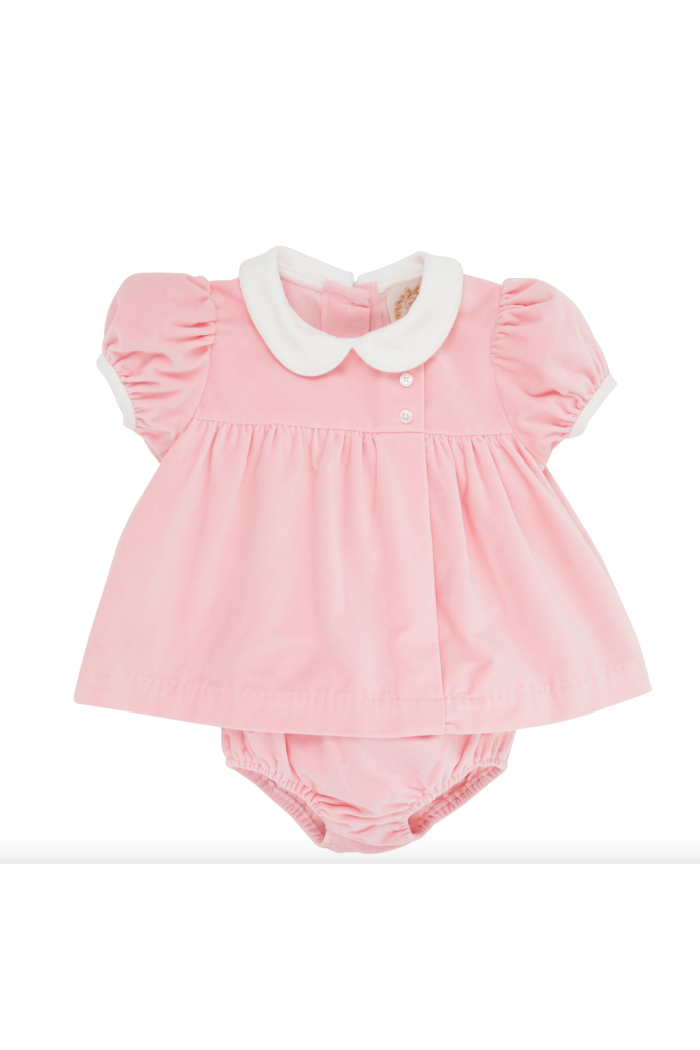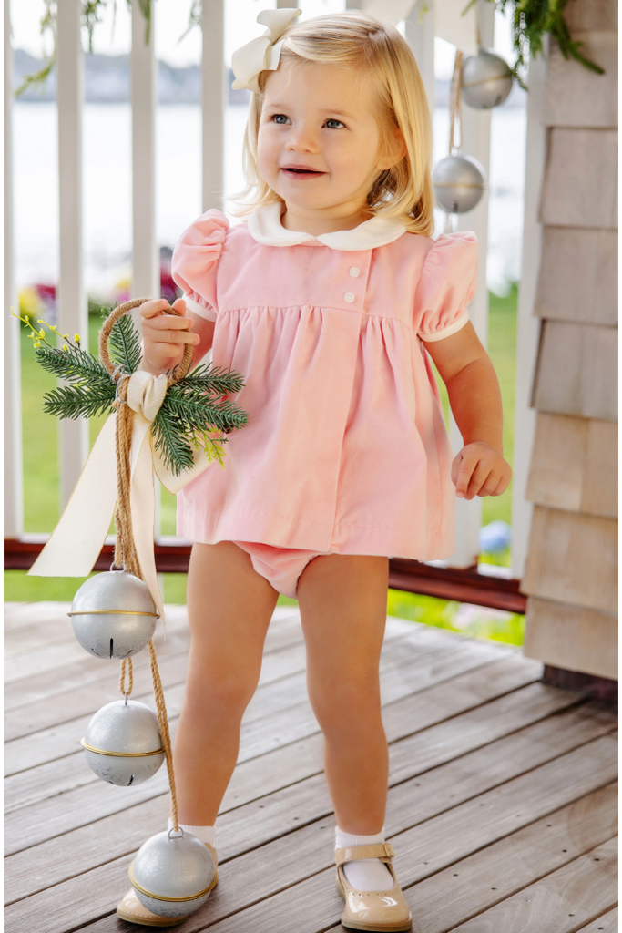 Your little lady will look just darling in our adorable Mary Baker Bloomer Set! Featuring a Sandpearl Pink with Palmetto Pearl velveteen fabric, this bloomer set is a must-have in her wardrobe!