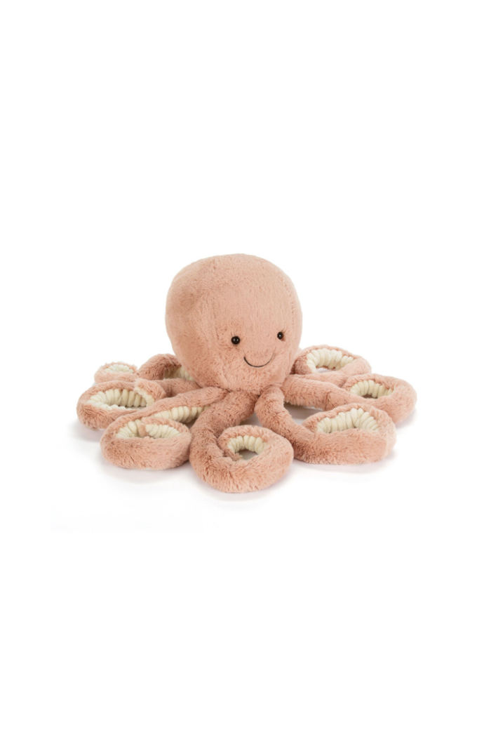 A soft, oversized plush octopus with long textured tentacles and a smiling face, perfect for cuddling and imaginative play. The Odell Octopus Large is made with plush, velvety fabric and stitched features for a gentle, tactile feel. This cuddly companion is made by Jellycat and is designed to be a comforting toy for babies and young children.