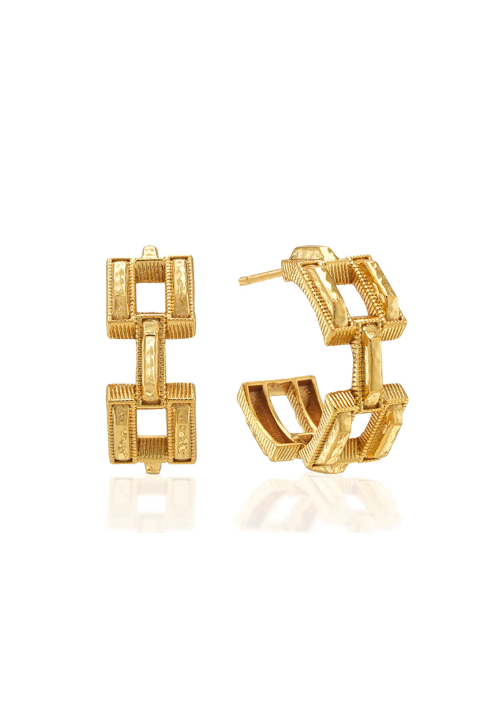A sculptural pair of gold-tone hoops formed from interlocking square links with hammered and ridged detailing. The Pathway Hoop Earrings have an architectural silhouette that reads modern and refined. Designed by Capucine de Wulf, they add a statement finish to both daytime tailoring and evening looks.