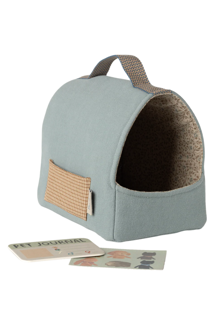 Extend playtime and take your favourite Maileg companion on every adventure. This pet carrier is thoughtfully designed with a spacious back pocket, perfect for bringing along your pet’s favourite accessories. A matching side pocket holds the included pet journal ID card, where you can write down important pet details and add one of the six included stickers, each featuring a charming drawing of a Maileg friend. Designed to fit Puppies, Dogs, Sleeping Bunnies, and Sleeping Kittens, this cosy bag ensures your special pet can travel along wherever the day leads.