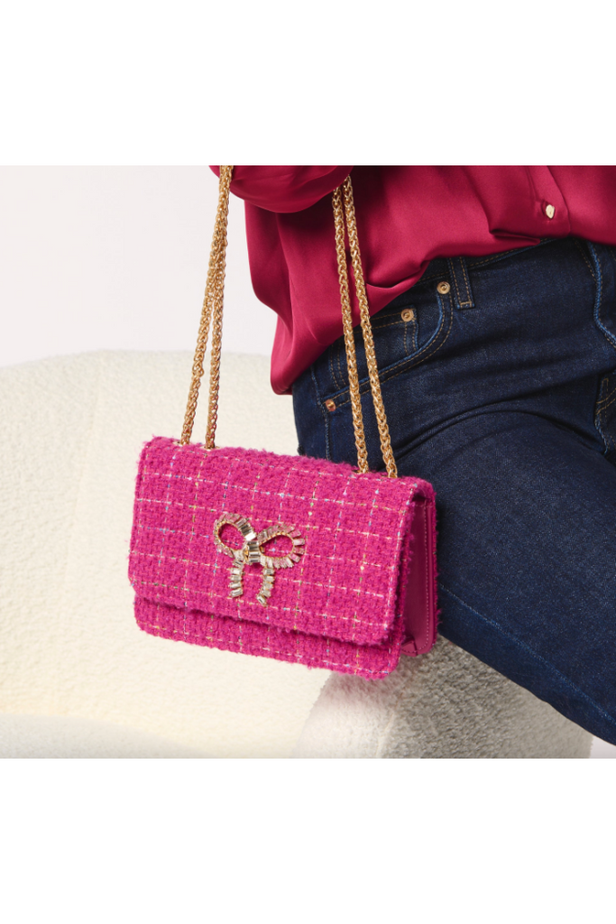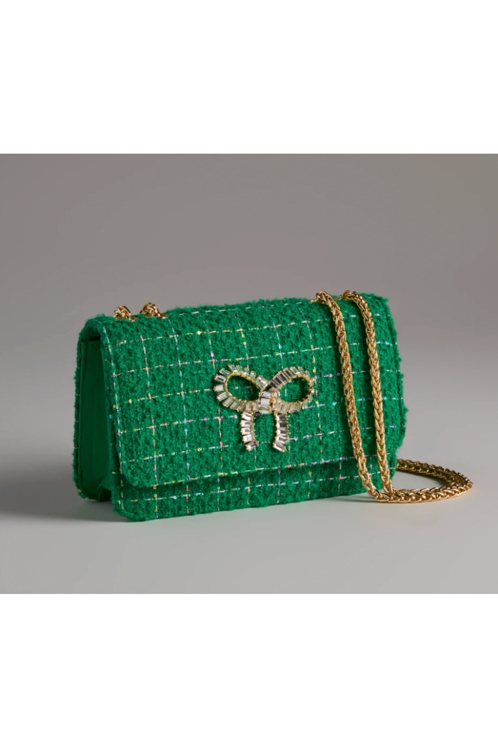 Make a statement with the Roa Shoulder Bag—a chic, structured piece that brings a pop of texture and sparkle to any outfit. Designed with luxe tweed fabric, this bag features double gold chain shoulder straps, a secure snap closure, and an interior slip pocket to stash your essentials. Whether you're headed to a holiday party or a brunch date, Roa adds an elevated touch of fun. Available in festive shades that play well with both glam and casual looks.