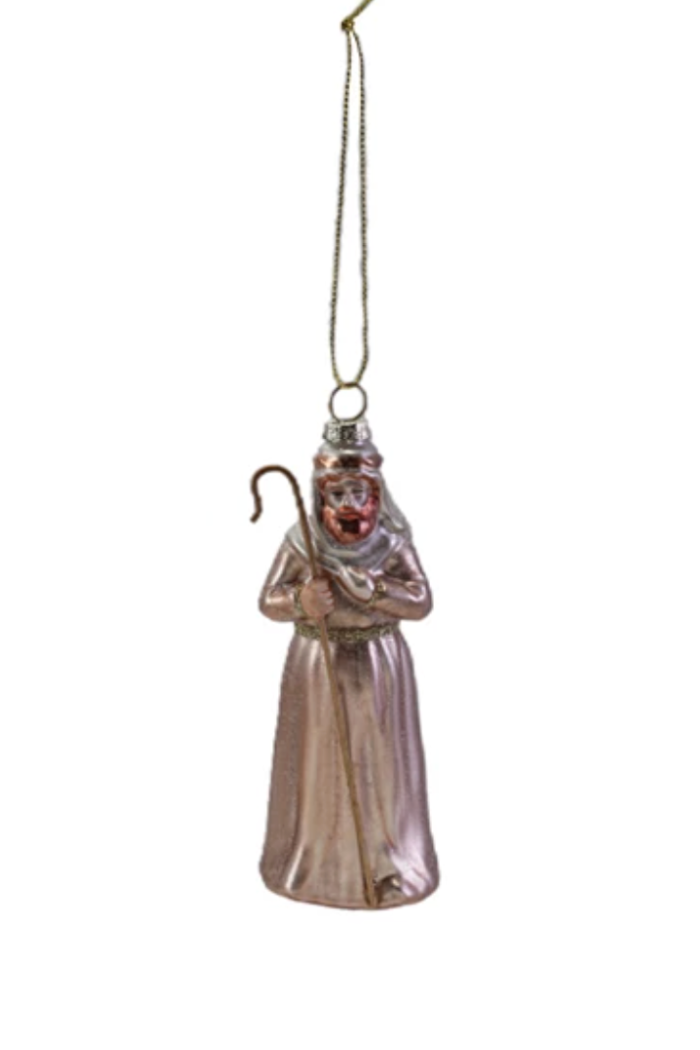 A delicate Shepherd Ornament hand-painted in metallic tones and shaped as a traditional shepherd holding a crook. This glass hanging ornament adds vintage-inspired charm to a holiday tree or nativity display. The piece features a gold loop for easy hanging and a detailed sculpted silhouette that catches the light. Pair it with other classic ornaments for a timeless seasonal look.