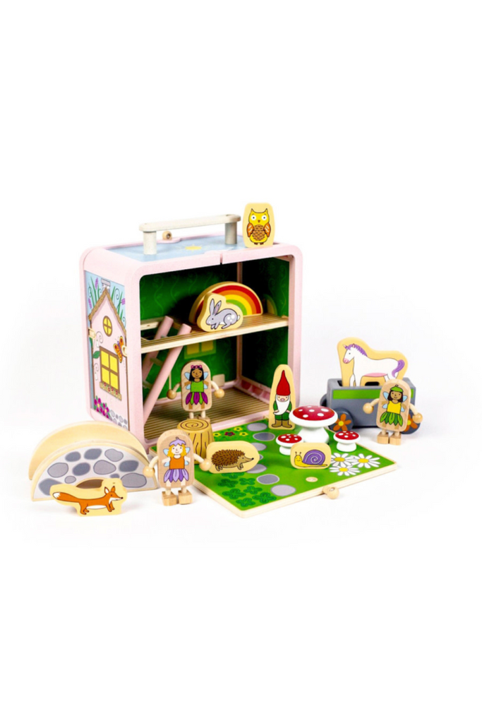 The 17-piece Fairy House has everything for whimsical fun on the go, including fairies, a unicorn, bridge, gnome,fairy, and more! Bonus: it’s all made of eco-friendly bamboo!