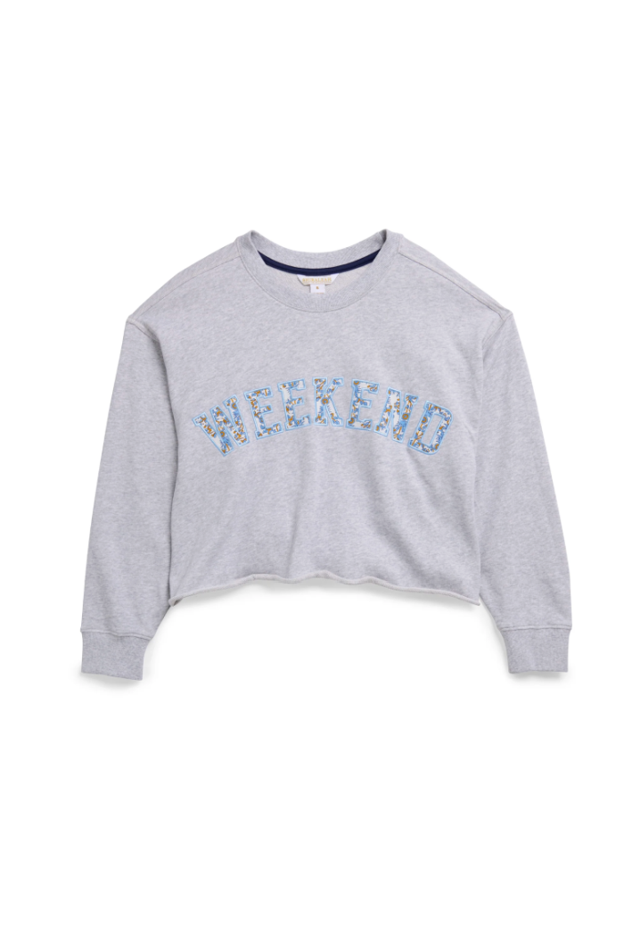 Ease into your weekend mood with the "Weekend" Lounge Sweatshirt – the coziest way to show your love for those laid-back days. Made from ultra-soft cotton fleece, this relaxed-fit pullover features playful “Weekend” lettering in a charming blue floral appliqué. The cropped cut pairs perfectly with your favorite high-waisted shorts or joggers to wear out of the house. For the full vibe, style it with our coordinating Striped Boxer Short or mix and match with any of our printed lounge bottoms.